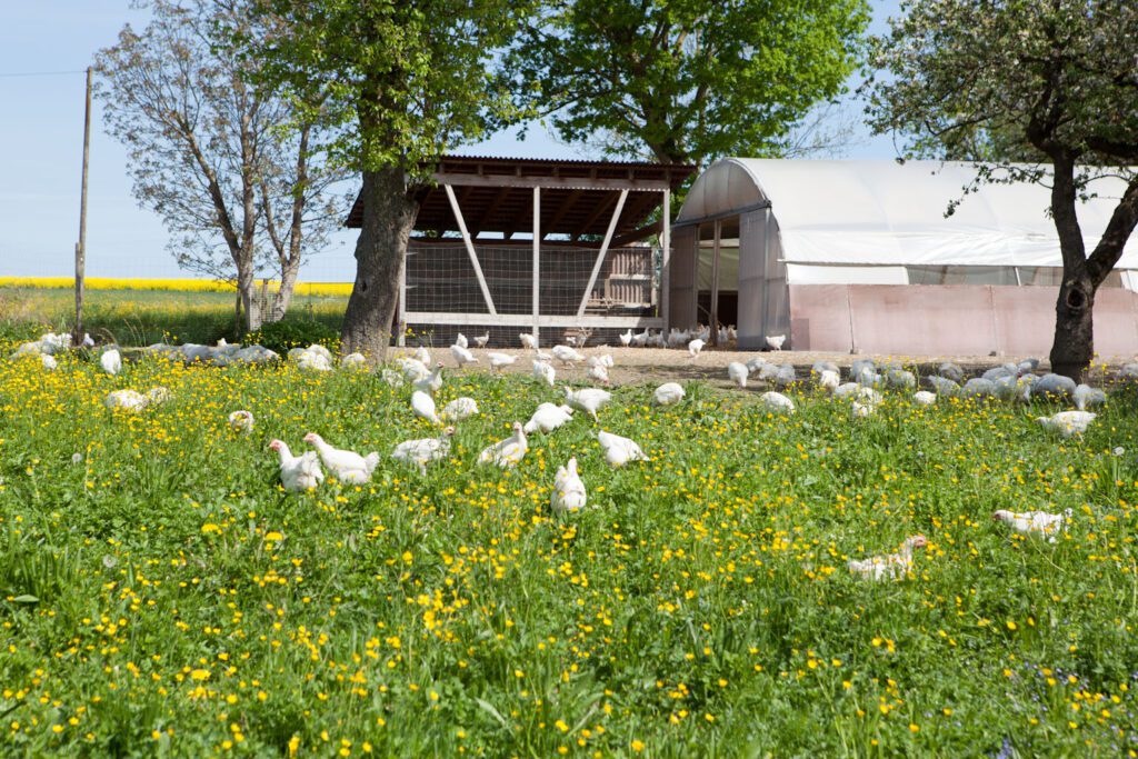 Sind die Landgockel groß genug, werden Sie in ein Folienhaus mit Auslauf umquartiert.